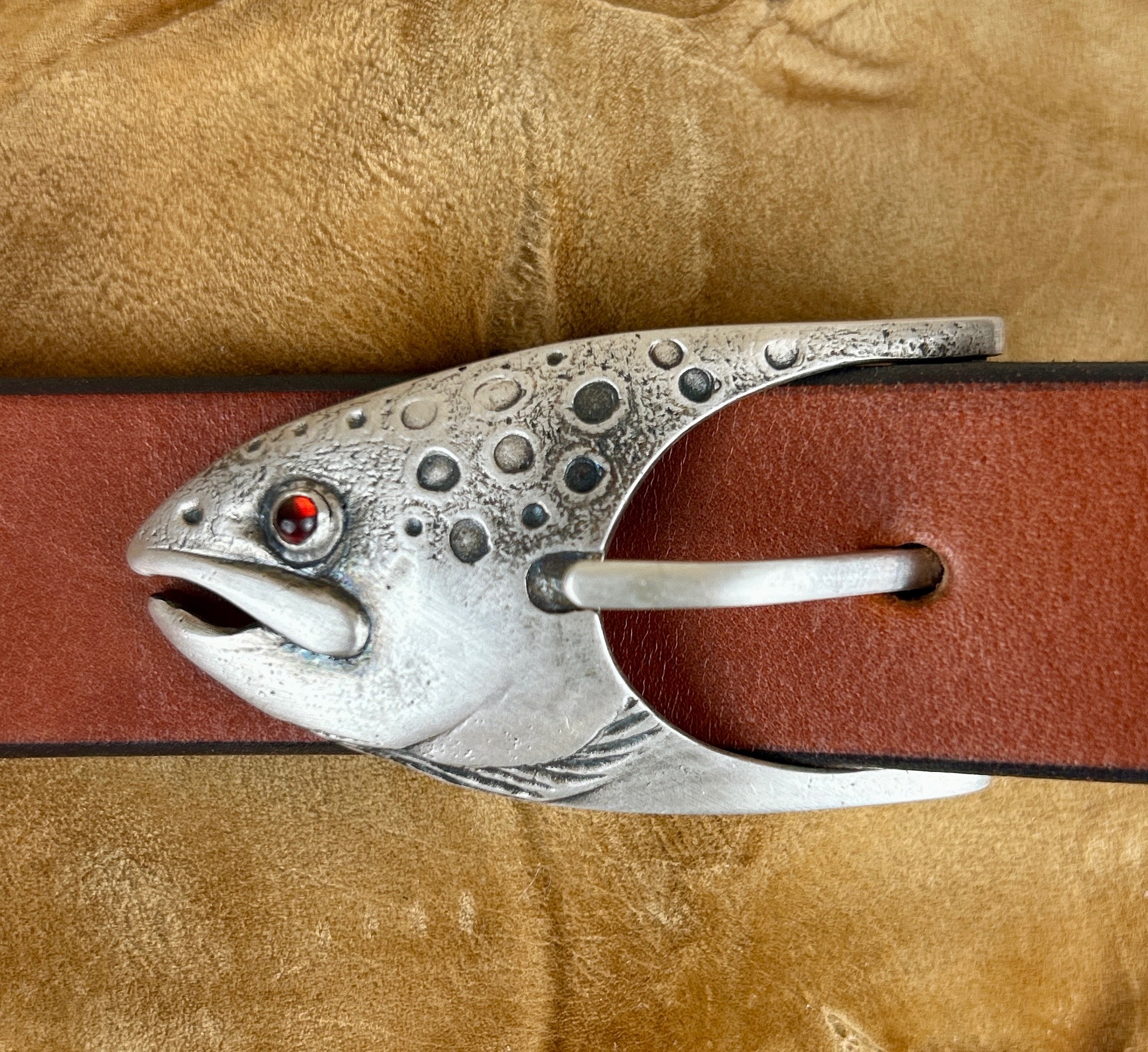 Sterling Brown Trout buckle with garnet eye. The buckle is approximately 2.5"x1.25", weighs just over 1 ounce and fits a 1.1/8" belt. Terry Walsh has over 60 years of experience and all of his work is handmade in his studio on the coast of Maine.